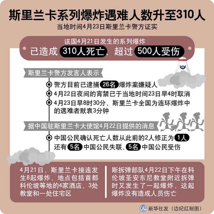 新華社科倫坡4月23日電(記者朱瑞卿 唐璐)斯里蘭卡警方23日證實,該國21日發生的系列爆炸已造成310人死亡、超過500人受傷。