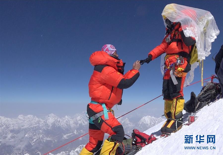 珠穆朗瑪峰頂,王銀龍向關(guān)嫻求婚(2018年5月16日攝)。新華社發(fā)