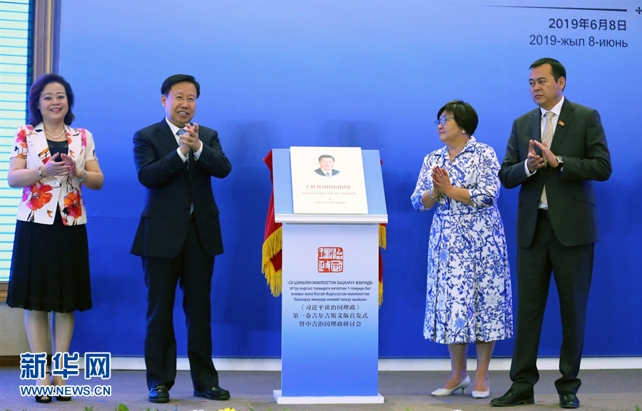 6月8日,在吉爾吉斯斯坦比什凱克,吉爾吉斯斯坦前總統(tǒng)奧通巴耶娃(右二)、吉爾吉斯斯坦議會副議長巴基羅夫(右一)、中宣部常務副部長王曉暉(左二)和中國駐吉爾吉斯斯坦大使杜德文(左一)共同為《習近平談治國理政》第一卷吉爾吉斯文版新書揭幕。 《習近平談治國理政》第一卷吉爾吉斯文版首發(fā)式暨中吉治國理政研討會6月8日在比什凱克總統(tǒng)官邸舉行。 新華社發(fā)(羅曼攝)