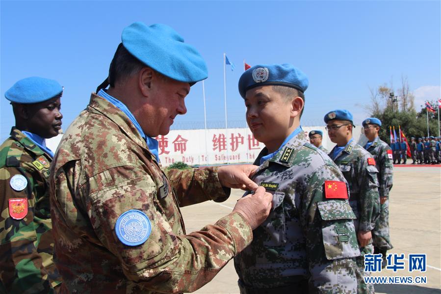 4月3日,在位于黎巴嫩南部辛尼亞村的中國維和部隊營區舉行的授勛儀式上,聯黎部隊司令德爾科爾(前左)為官兵代表佩戴勛章。新華社發