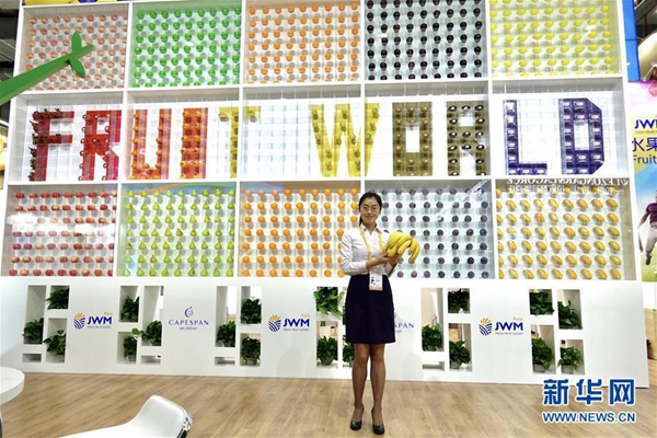 11月5日,第二屆進博會展區的工作人員展示香蕉等各色水果。 第二屆中國國際進口博覽會正在上海國家會展中心舉行,各展區色彩豐富的展品與設計讓人應接不暇。 新華社記者才揚 攝