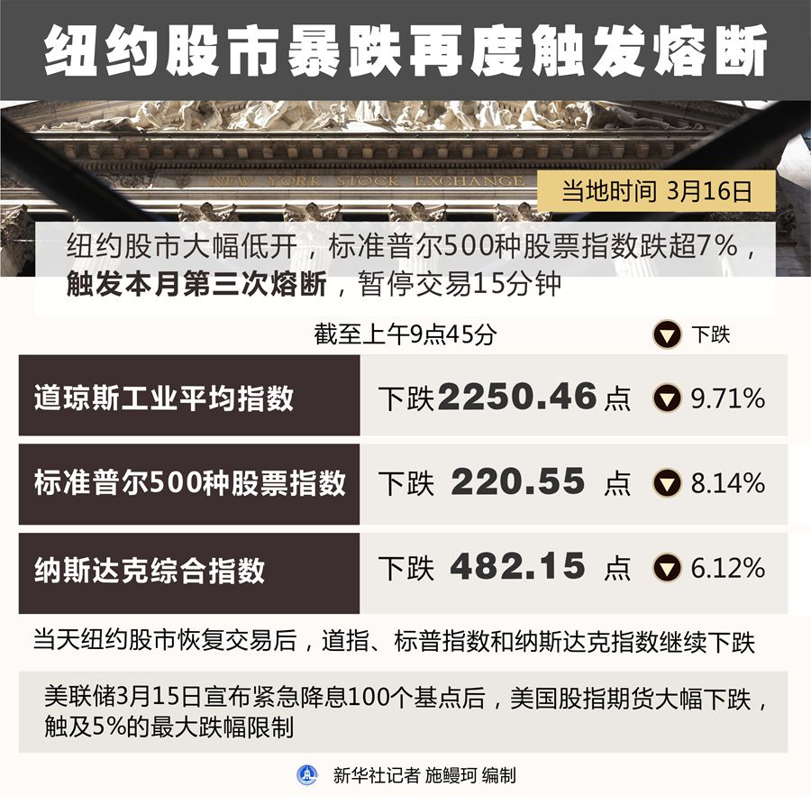 由于新冠肺炎疫情在美國持續(xù)擴散引發(fā)市場廣泛擔(dān)憂,紐約股市16日開盤暴跌,并再次觸發(fā)7%的熔斷點。交易重啟后跌幅擴大,收盤時紐約股市三大股指均暴跌超過11%。