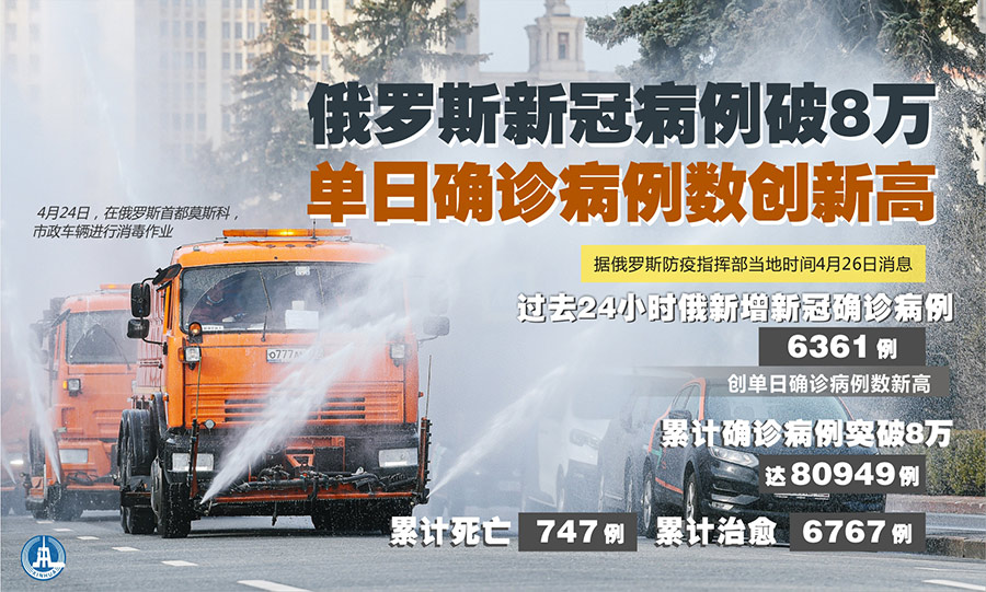 新華社莫斯科4月26日電(記者魯金博)據(jù)俄羅斯防疫指揮部26日消息,過去24小時俄新增新冠確診病例6361例,創(chuàng)單日確診病例數(shù)新高,累計確診病例突破8萬,達80949例。