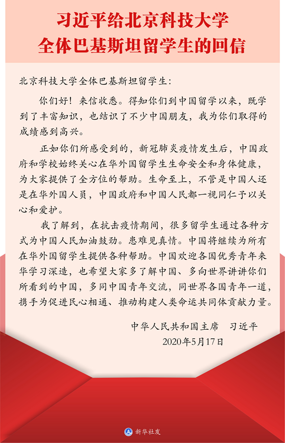 圖表:習近平給北京科技大學全體巴基斯坦留學生的回信 新華社發