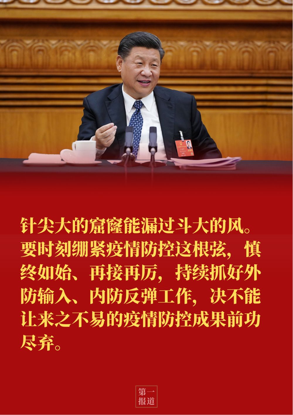 習近平指出:“針尖大的窟窿能漏過斗大的風。要時刻繃緊疫情防控這根弦,慎終如始、再接再厲,持續抓好外防輸入、內防反彈工作,決不能讓來之不易的疫情防控成果前功盡棄。”