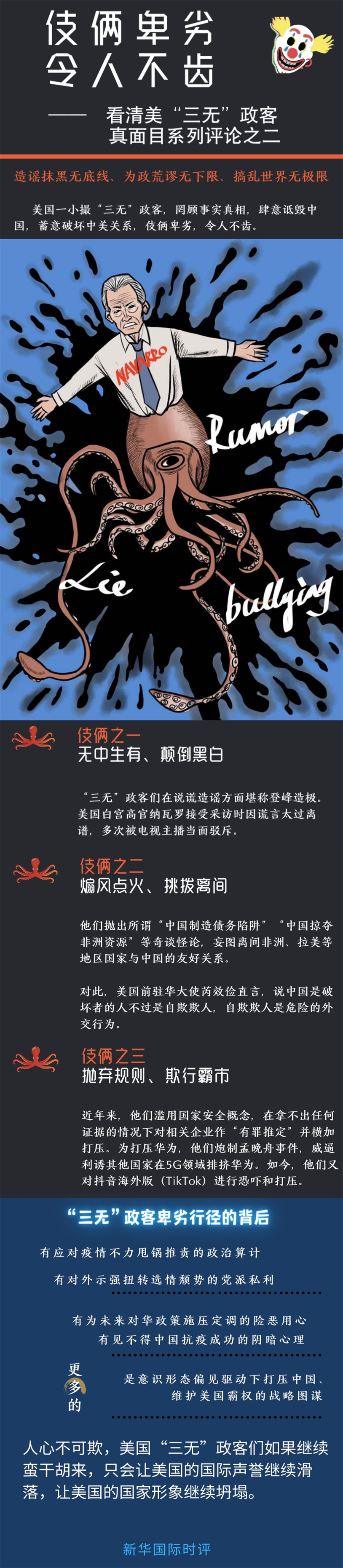 回憶在中央情報局的任職經歷時,美國國務卿蓬佩奧難得說了句實話:“我們撒謊、我們欺騙、我們偷竊……這才是美國不斷探索進取的榮耀。”在這種畸形價值觀的驅動下,美國一小撮造謠抹黑無底線、為政荒謬無下限、搞亂世界無極限的“三無”政客罔顧事實真相,肆意詆毀中國,蓄意破壞中美關系,伎倆卑劣,令人不齒。