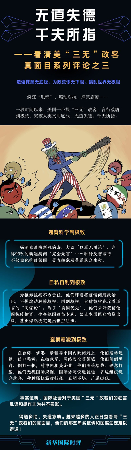 瘋狂“甩鍋”、煽動(dòng)對(duì)抗、肆意霸凌……一段時(shí)間以來,美國(guó)一小撮造謠抹黑無底線、為政荒謬無下限、搞亂世界無極限的“三無”政客,言行荒唐到極致,突破人類文明底線,無道失德,千夫所指。
