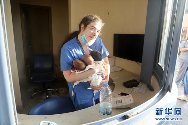 8月4日,在黎巴嫩首都貝魯特,一名護(hù)士在受損的醫(yī)院內(nèi)照料三名嬰兒。新華社發(fā)(比拉爾·賈維希攝)