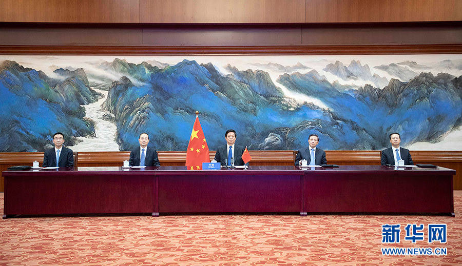 8月19日,全國(guó)人大常委會(huì)委員長(zhǎng)栗戰(zhàn)書在北京人民大會(huì)堂出席第五次世界議長(zhǎng)大會(huì)視頻會(huì)議。 新華社記者 李濤 攝