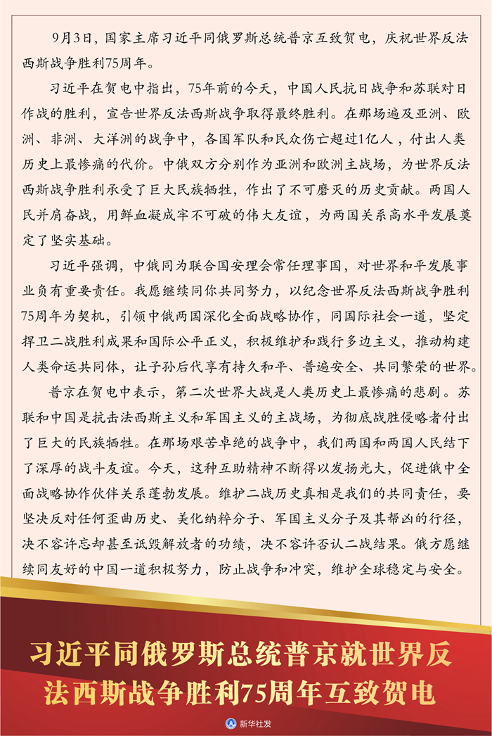 習(xí)近平在賀電中指出,75年前的今天,中國(guó)人民抗日戰(zhàn)爭(zhēng)和蘇聯(lián)對(duì)日作戰(zhàn)的勝利,宣告世界反法西斯戰(zhàn)爭(zhēng)取得最終勝利。在那場(chǎng)遍及亞洲、歐洲、非洲、大洋洲的戰(zhàn)爭(zhēng)中,各國(guó)軍隊(duì)和民眾傷亡超過(guò)1億人,付出人類歷史上最慘痛的代價(jià)。中俄雙方分別作為亞洲和歐洲主戰(zhàn)場(chǎng),為世界反法西斯戰(zhàn)爭(zhēng)勝利承受了巨大民族犧牲,作出了不可磨滅的歷史貢獻(xiàn)。兩國(guó)人民并肩奮戰(zhàn),用鮮血凝成牢不可破的偉大友誼,為兩國(guó)關(guān)系高水平發(fā)展奠定了堅(jiān)實(shí)基礎(chǔ)。