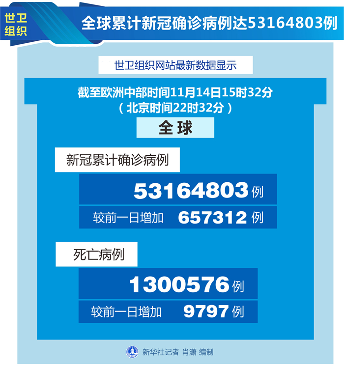 新華社日內瓦11月14日電(記者劉曲)世界衛生組織14日公布的最新數據顯示,全球累計新冠確診病例達53164803例。