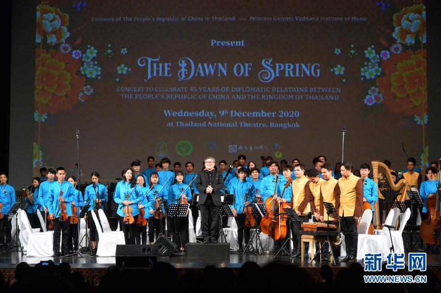 12月9日,在泰國曼谷國家大劇院,干拉耶尼音樂學院交響樂團在慶祝中泰建交45周年音樂會上謝幕。新華社發(拉亨攝)