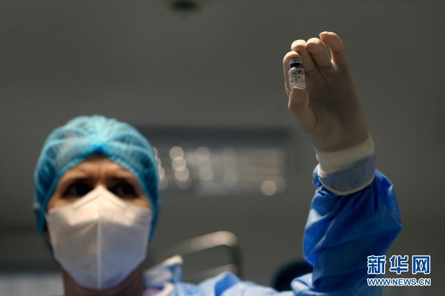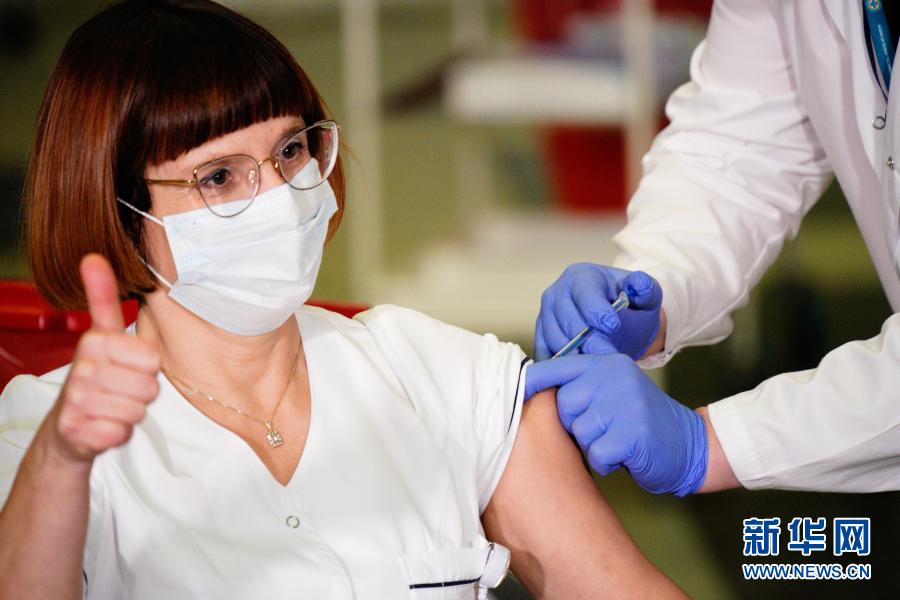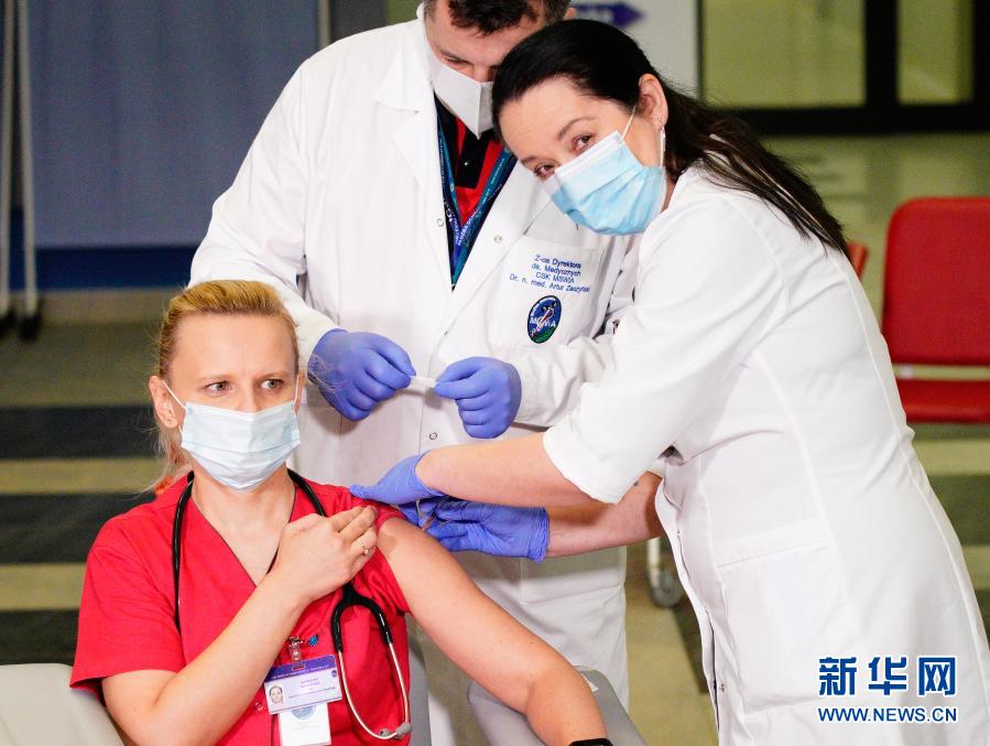 12月27日,在波蘭首都華沙一家醫院,一名護士接種新冠疫苗。新華社發(亞普·阿林攝)