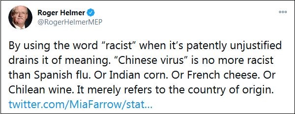 不料,這條評論徹底“翻車”。赫爾默是一名英國獨立黨成員,政治立場偏保守,批評英國的國家醫療服務體系(NHS),并否定歐盟的氣候政策。過去一年間,他曾多次將新冠病毒污蔑為“中國病毒”,還曾轉發過特朗普的相關視頻。