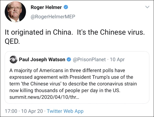 赫爾默28日推文稱不要將病毒變種稱為“起源自英國”,但4月發布的下圖聲稱病毒“起源自中國,就是中國病毒”。