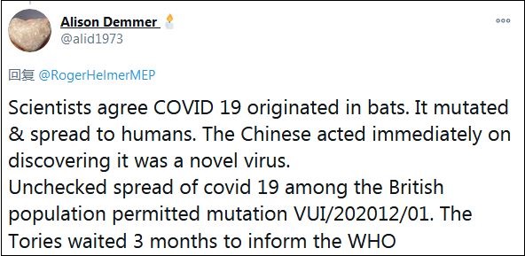 赫爾默在28日的推特中寫道:“我們能停止將變異新冠病毒稱為‘在英國起源’嗎?它(病毒)只是在英國發現,這(和英國起源)完全是兩碼事。”