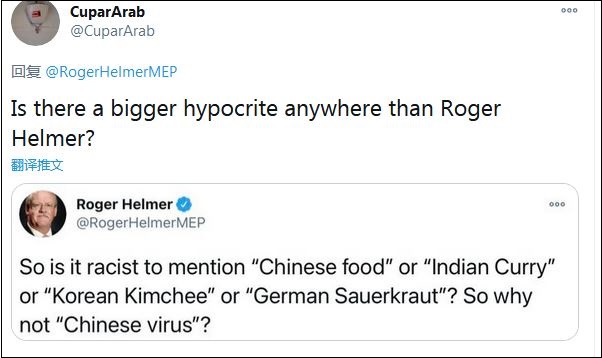 不少網友指出了赫爾默的雙標。“議員先生,你管這(新冠病毒)叫‘中國病毒’,為什么不也把它叫做英國病毒?”