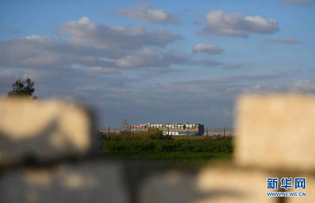 這是3月29日拍攝的移動至埃及蘇伊士運河正常航道上的重型貨輪。