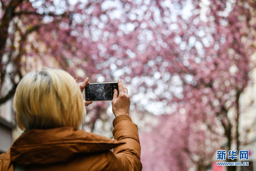 4月13日,一名游人在德國(guó)波恩老城區(qū)用手機(jī)拍攝盛開的櫻花。