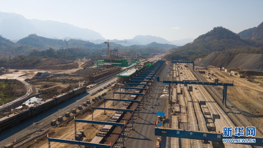 這是2020年12月29日在老撾瑯勃拉邦拍攝的中老鐵路瑯勃拉邦車站鋪軌現場(航拍照片)。新華社發(老中鐵路有限公司供圖)
