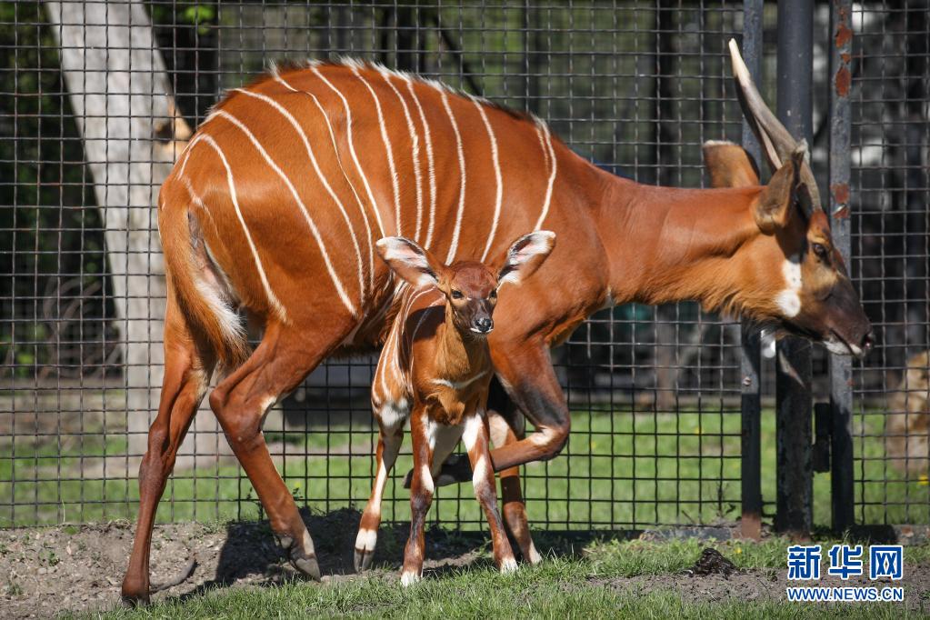 5月10日,兩周大的幼年山地紫羚與母親一起在波蘭首都華沙的華沙動物園的籠舍中散步。