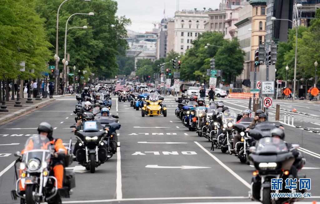 5月30日,在美國首都華盛頓,參加“滾雷”摩托車大游行的車輛駛過街頭。