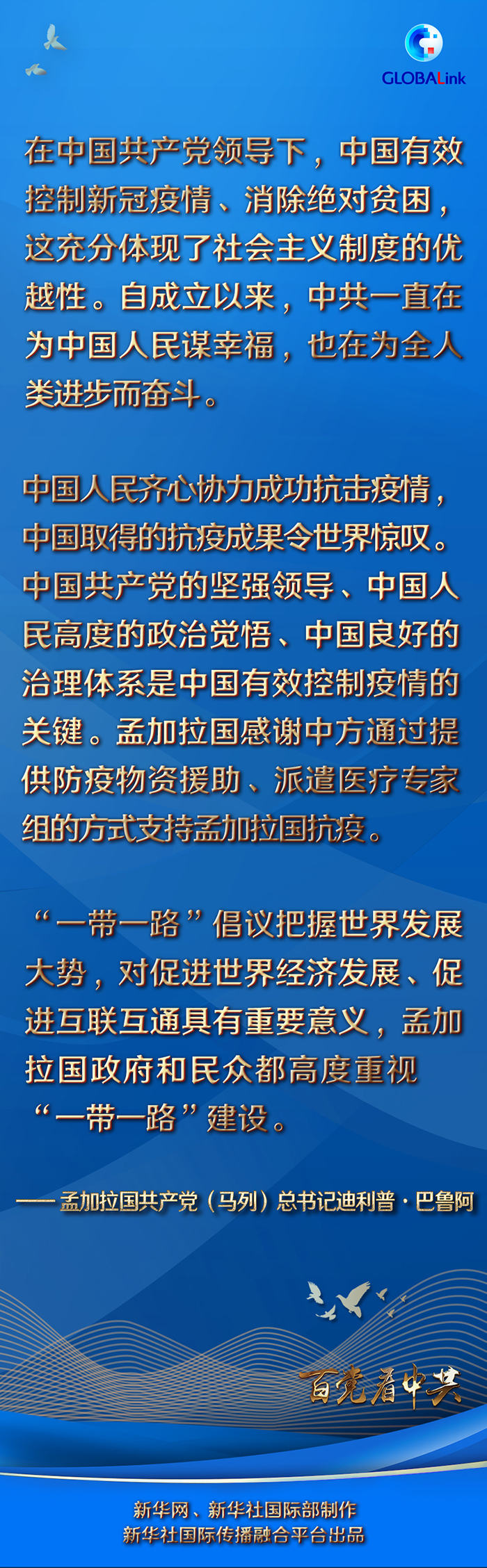巴魯阿表示,百年來,中國共產(chǎn)黨根據(jù)本國國情不斷繼承和發(fā)展馬克思主義,并在這一過程中實現(xiàn)發(fā)展壯大。孟加拉國共產(chǎn)黨(馬列)與中國共產(chǎn)黨保持著兄弟般的關(guān)系。1976年以來,兩黨經(jīng)常派遣代表團互訪。訪問中國期間,中國共產(chǎn)黨的干部給他留下了深刻印象。巴魯阿說:“他們責任感強、熱情友好、理論經(jīng)驗豐富。在交流中,我們真切感受到,中共在建設(shè)中國特色社會主義道路上不斷前進,這讓人欽佩、印象深刻?!?/p>