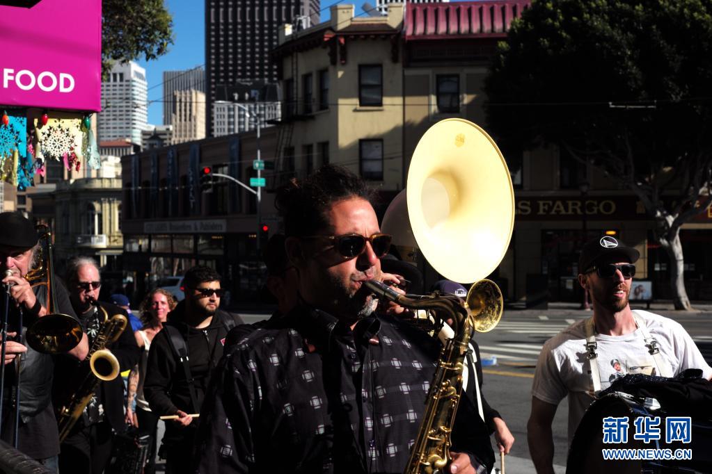 6月15日,一支樂隊在美國加利福尼亞州舊金山街頭演奏。