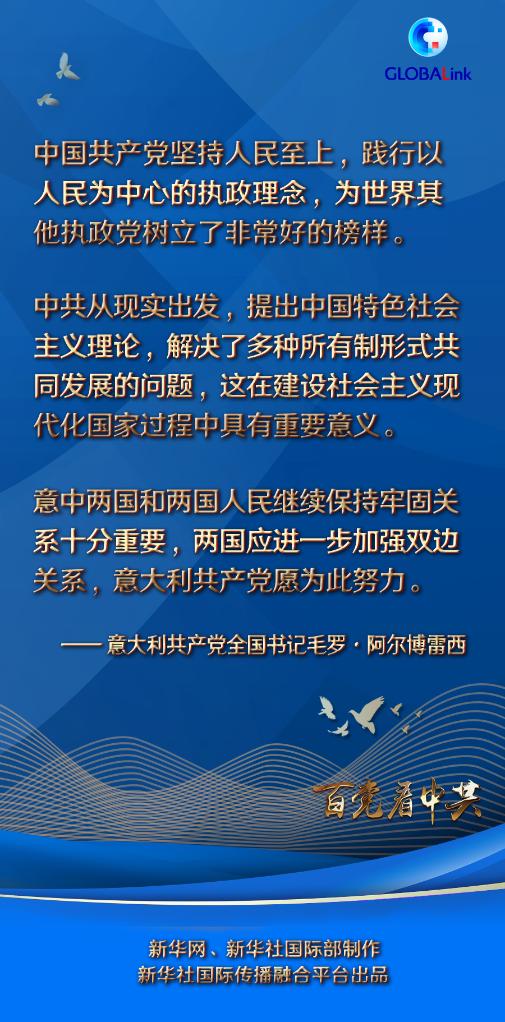 談及意中兩國關(guān)系,阿爾博雷西表示,意中兩國都對人類發(fā)展作出了貢獻(xiàn),兩國和兩國人民繼續(xù)保持牢固關(guān)系十分重要。“兩國應(yīng)進一步加強雙邊關(guān)系,意大利共產(chǎn)黨愿為此努力。”(編輯:陳波、何夢舒、王昭、齊紫劍、趙嫣、王曉梅、湯潔峰、謝棟風(fēng)、劉向、謝琳、班威、李雪梅、王申;海報設(shè)計:楊霽昕)
