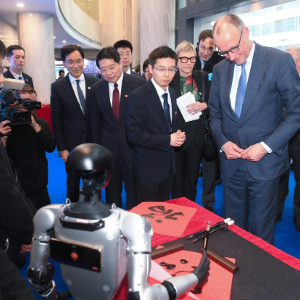 当天中午,默茨飞抵浙江杭州。在人形机器人企业宇树科技,默茨与“春晚同款”机器人零距离互动。伴随着铿锵有力的鼓点,身着红色喜庆上衣的机器人时而腾挪闪转,时而凌空翻跃,引得默茨频频鼓掌,惊叹不已。随访的德国商界代表也纷纷举起手机,记录下一幕幕充满未来感的瞬间。